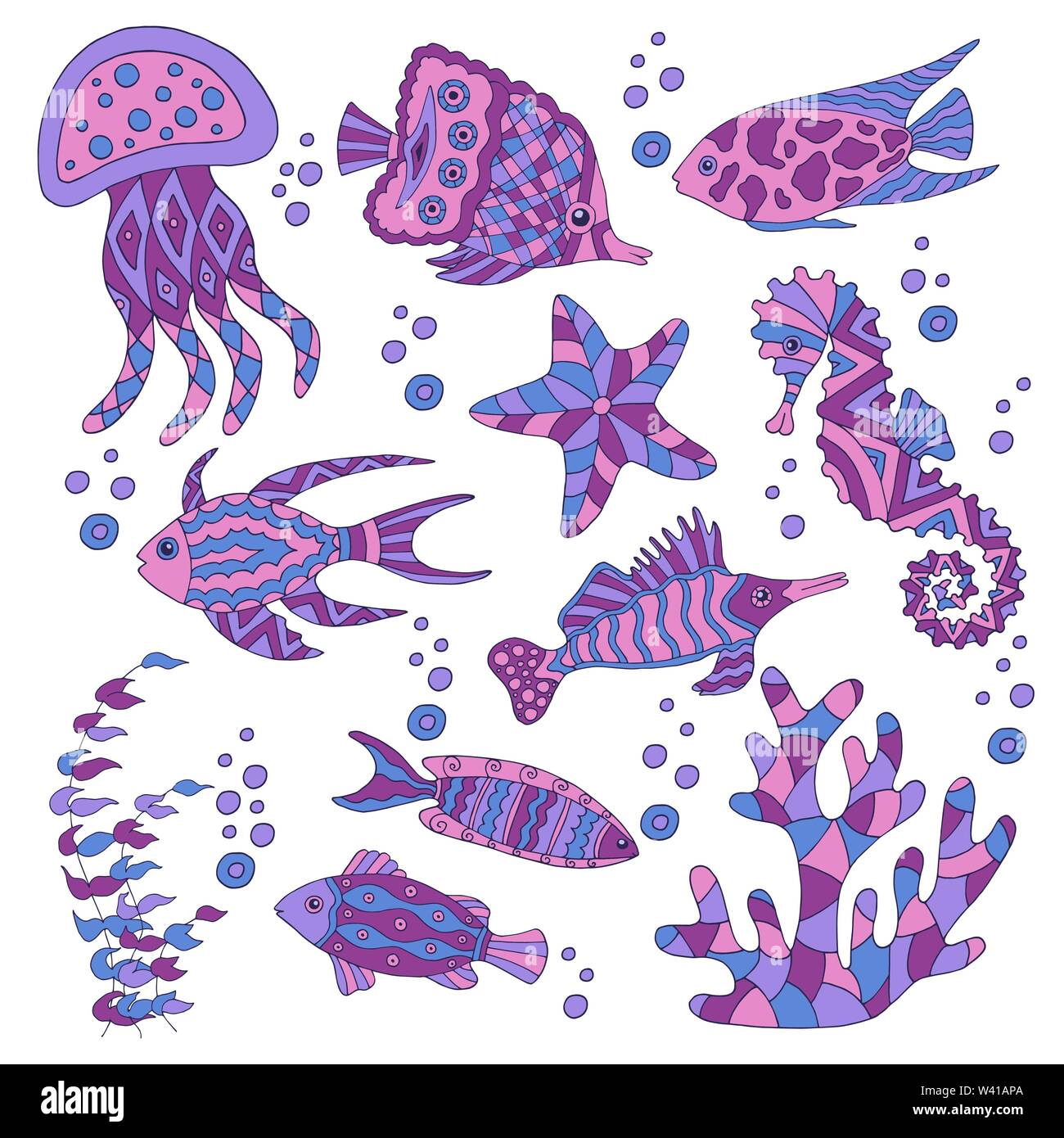 Von Hand Gezeichnet Und Meer Fische Gemalt Seesterne Korallen Seepferdchen Quallen Und Algen Auf Weissem Hintergrund Stock Vektorgrafik Alamy