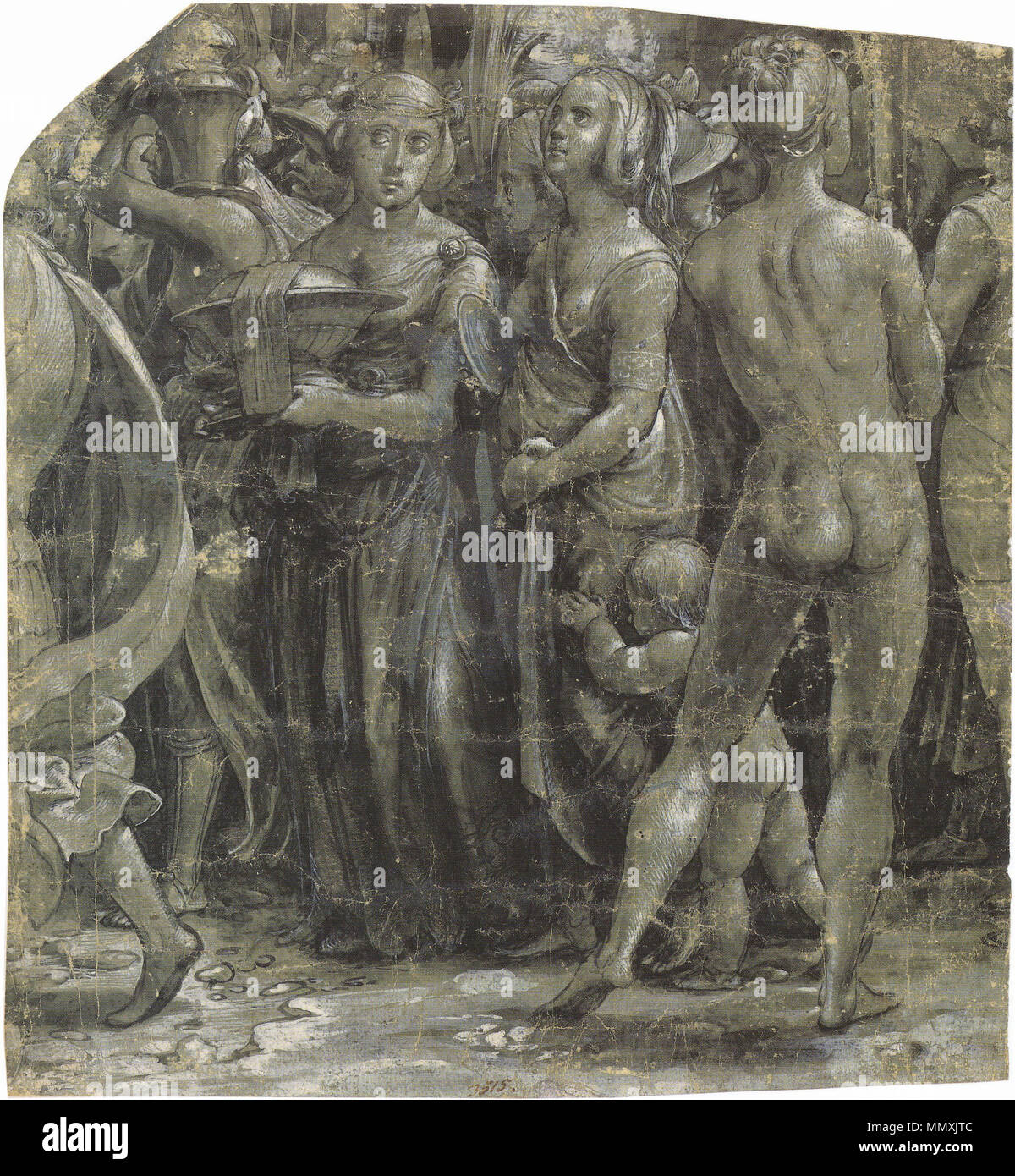 Englisch Fragment Einer Szene Mit Klassischen Figuren Hell Dunkel Zeichnen Burste Schwarz Grau Waschen Weiss Gehoht