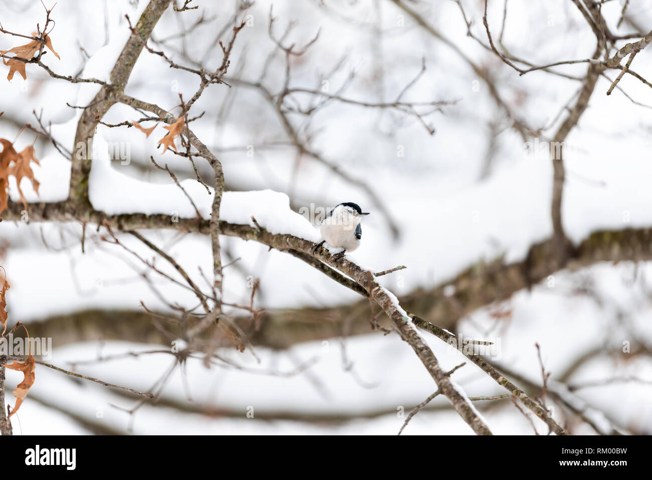 Eine White Breasted Kleiber Vogel Auf Baumstamm Im Winter Schneeflocken Schnee Eiche In Virginia Weiss Hintergrund Herbst Winter Oder Im Fruhling Stockfotografie Alamy